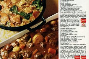 Vintage recipes in this Campbell’s emergency dinner cookbook include Pot roast, Frankfurter boats, Campbelled eggs, Skillet meatloaf, Spanish rice, Macaroni & cheese, Tuna supreme, Chicken crunch & more.